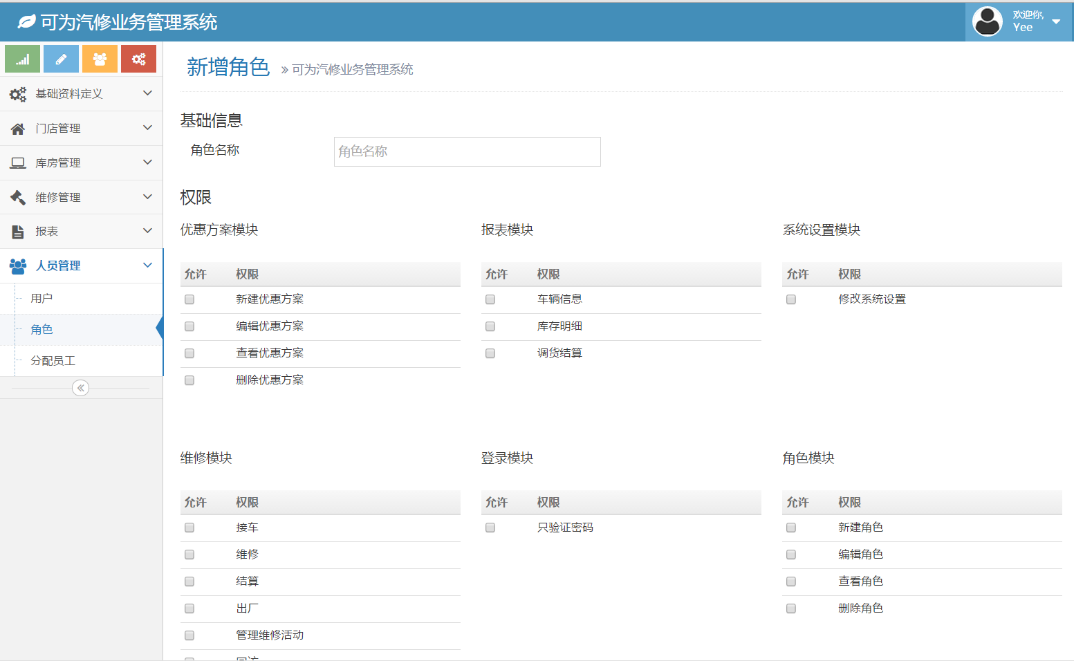 - 预置常用角色像店长、前台接待、维修接待、库管、配送等,也可随意自定义你需要的角色及相应的权限